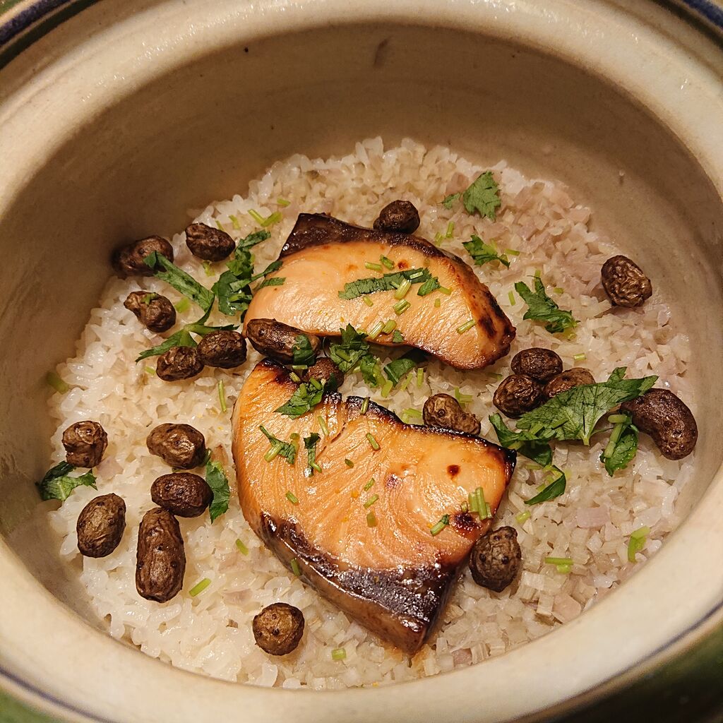 お食事は土鍋ご飯『鰤の幽庵焼き 牛蒡 蓮根 零余子(ムカゴ) 三つ葉 柚子』