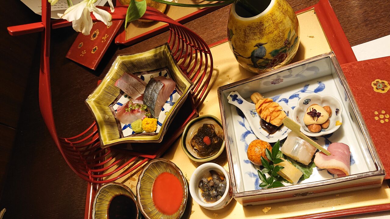 『烏賊塩辛 生子霙合え 鰤燻製 白梅貝酒煮 金沢長芹 梅長芋 玉子真丈』