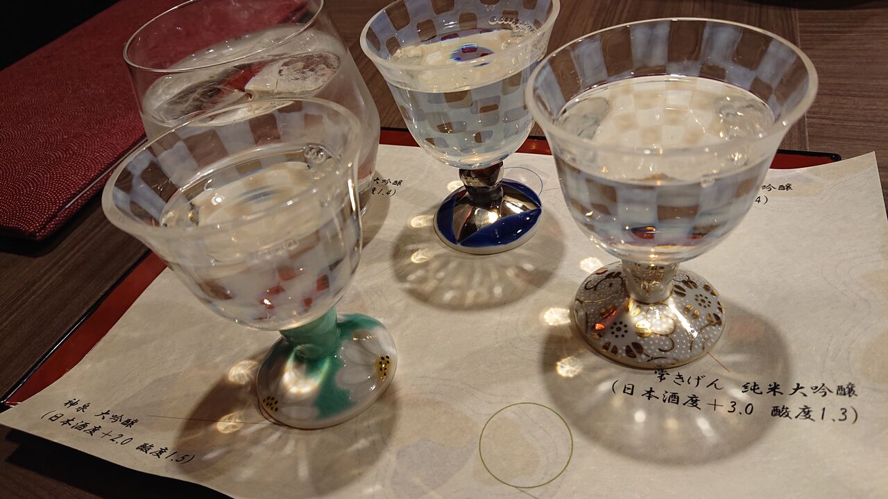 お酒は『神泉 大吟醸、常きげん 純米大吟醸、天狗舞 古古酒 純米大吟醸』の飲み比べ。