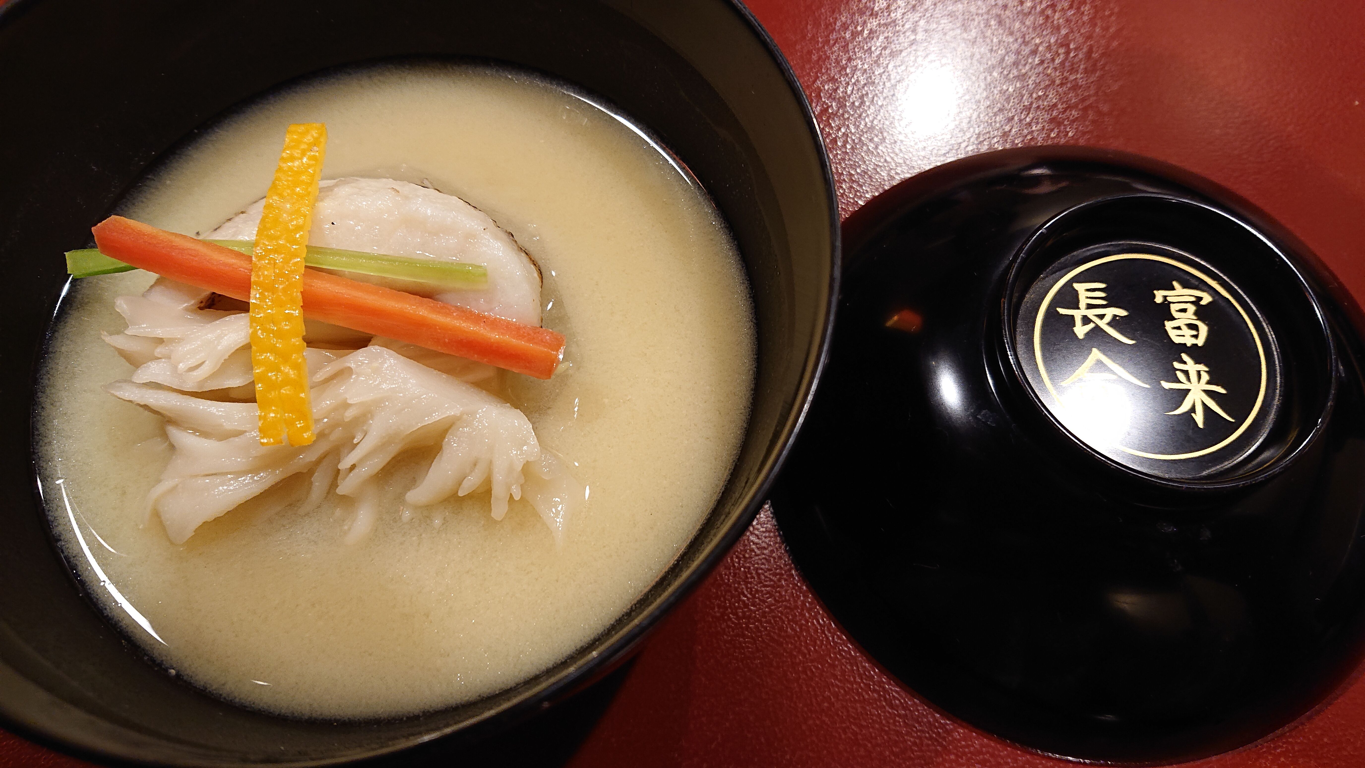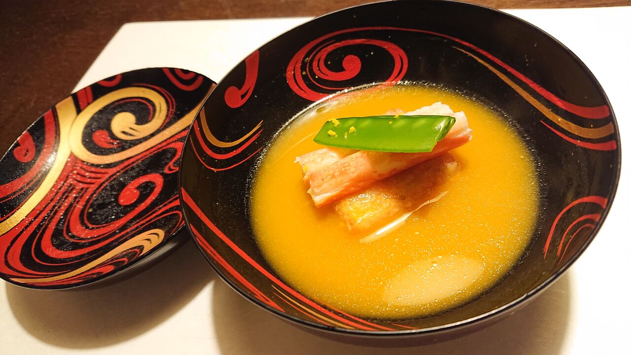 続いて、お椀は『白味噌仕立て 蕪釜 鯛 蟹味噌豆腐 松葉柚子 白舞茸』