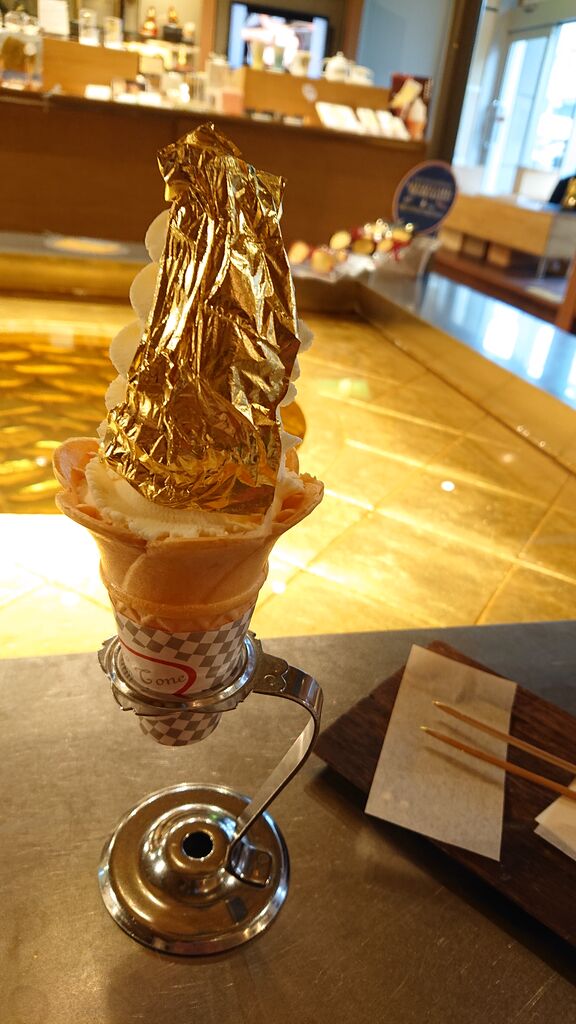 店内では自分で金箔をオンザソフトできるとのことで連れが挑戦!なかなかうまいんじゃない?!