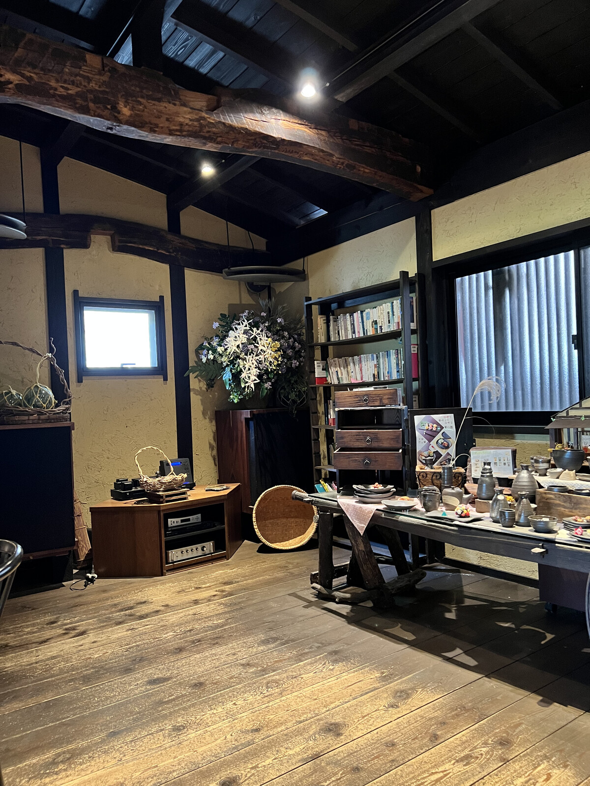 民芸家具や反物がおされにディスプレイ。