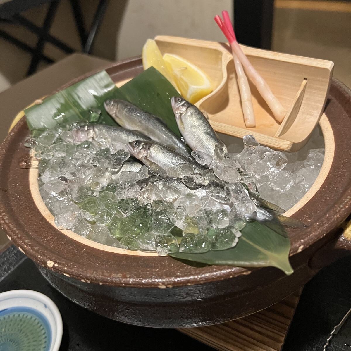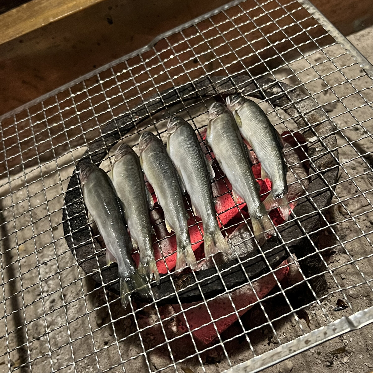 焼物は目の前の囲炉裏で鮎を炭火焼きに。