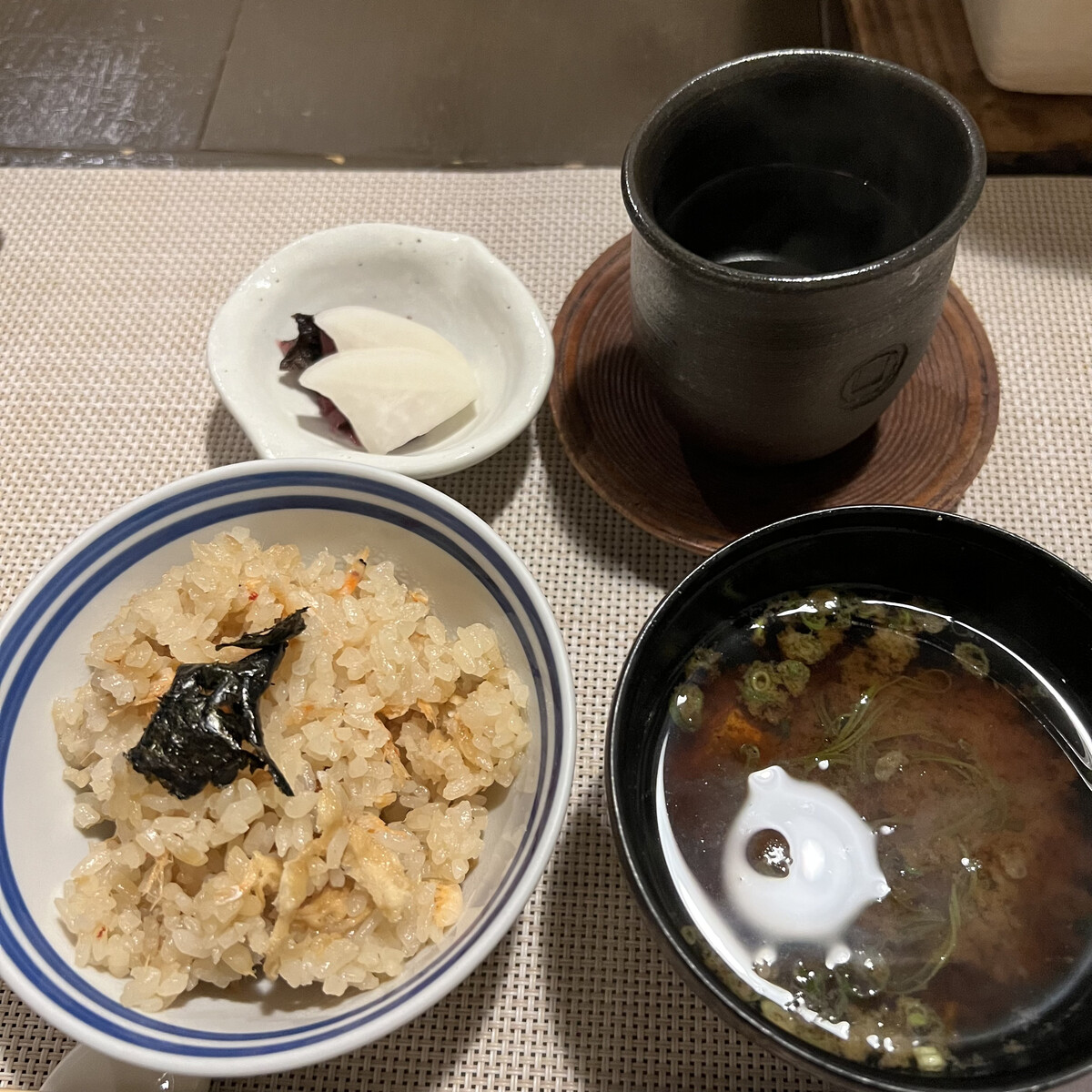 〆は桜海老の炊き込みご飯と赤だし。