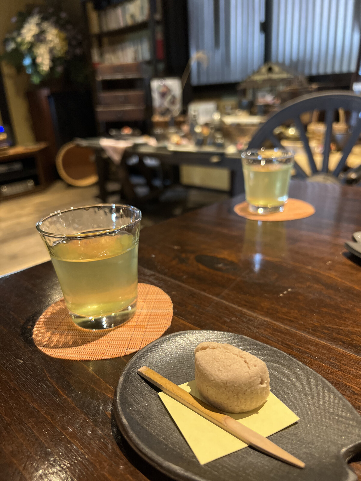 ウエルカムドリンクは冷たい緑茶と自家製のお菓子。