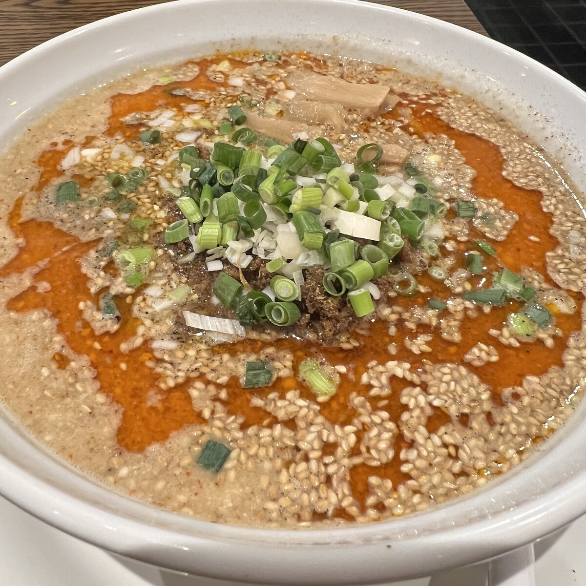 たっぷり浮かんだ胡麻とラー油がインパクトばっちり。