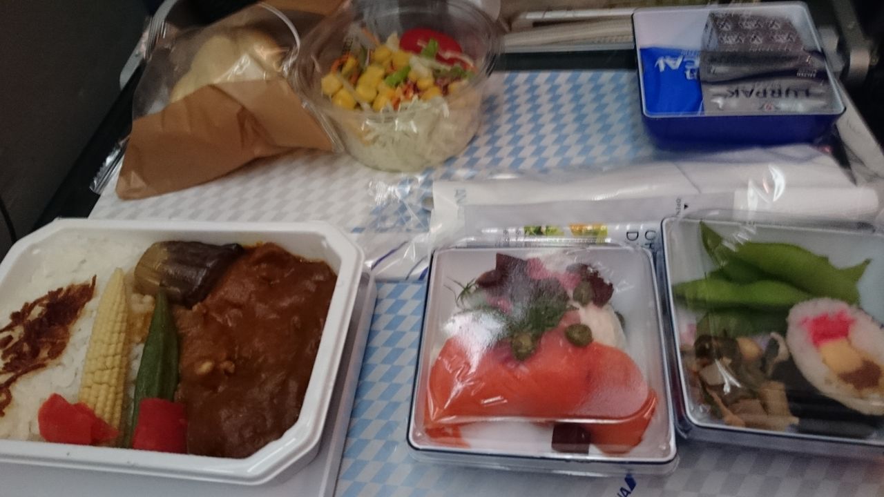 先ほどつけ麺をもりもり食べた後にさらに機内食。こんな時間に笑