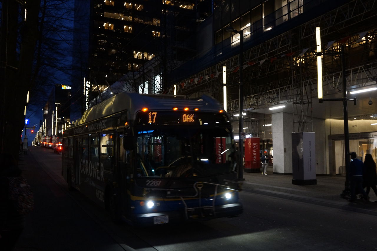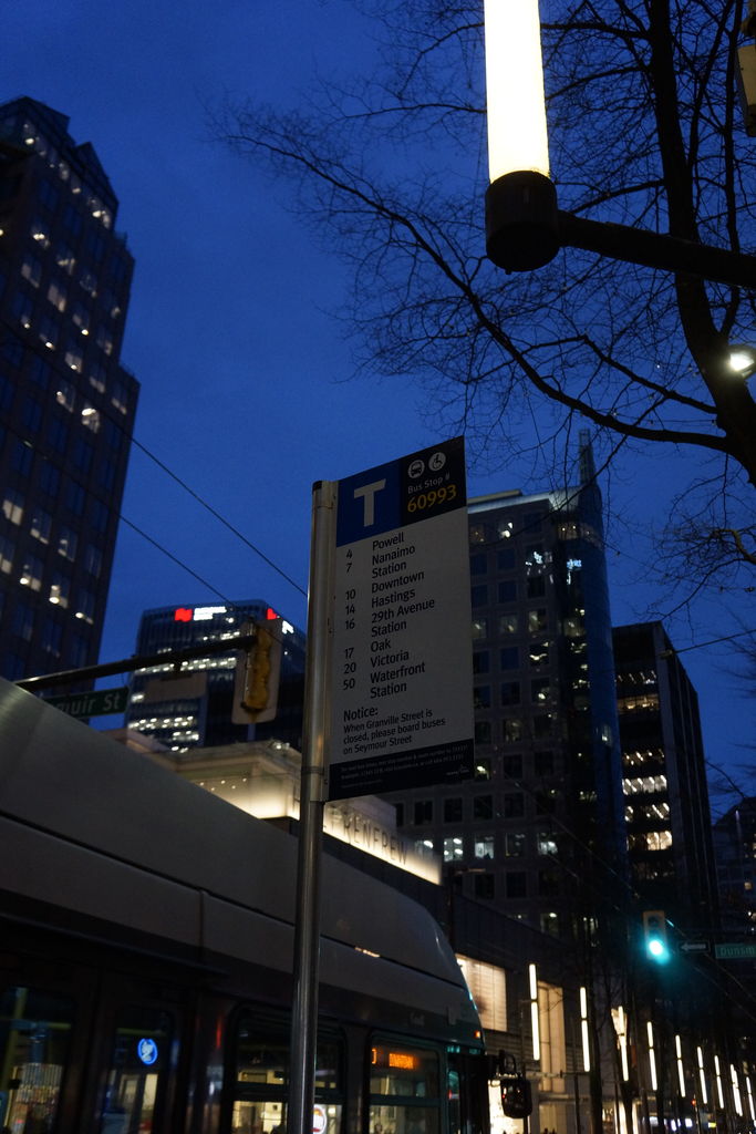ホテルから歩いて数分のバス停「Northbound Granville St @ Dunsmuir St」でしばし待つ。
