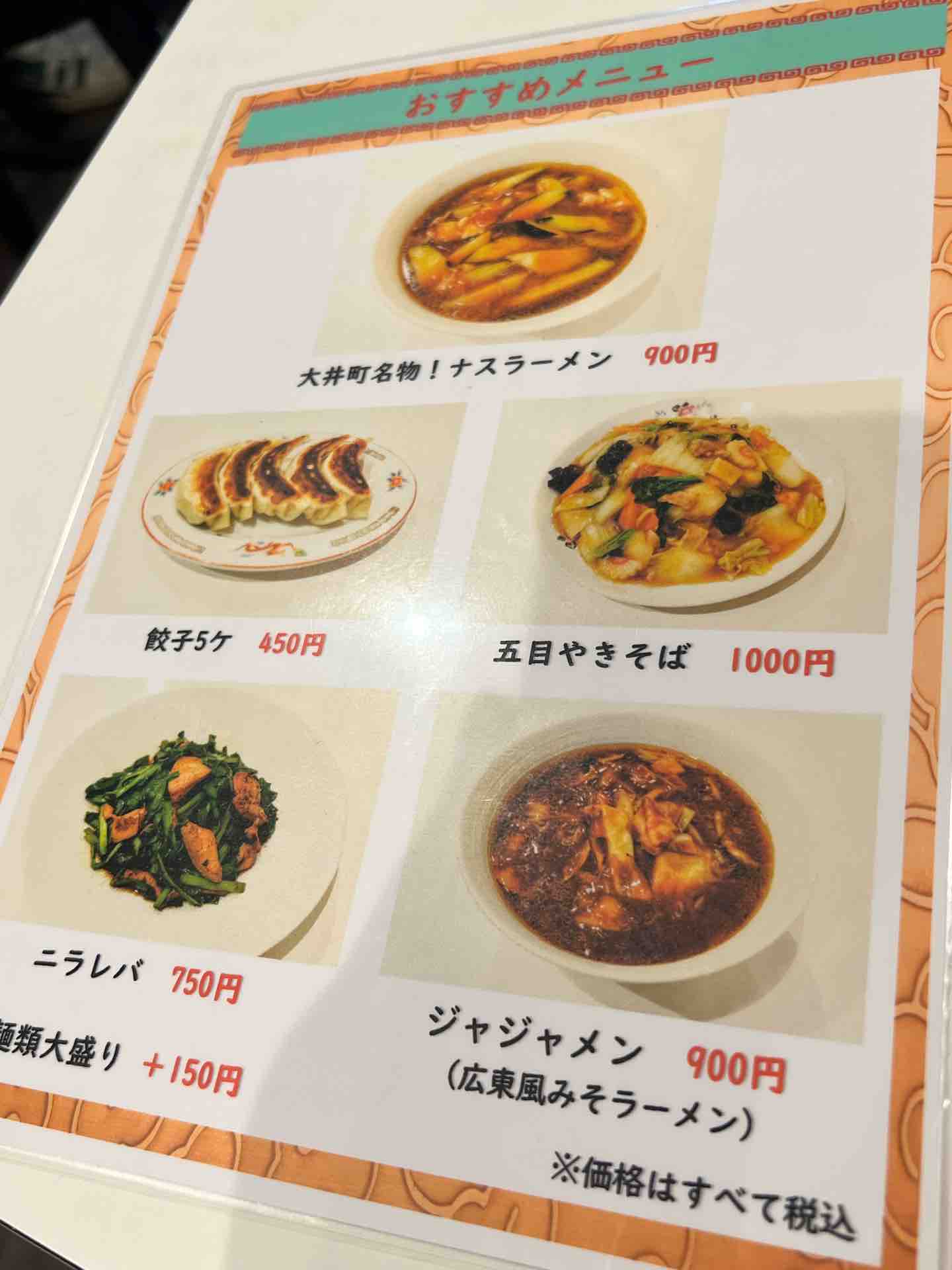 町中華感たっぷりのメニュー表。トップはもちろん「大井町名物!ナスラーメン」