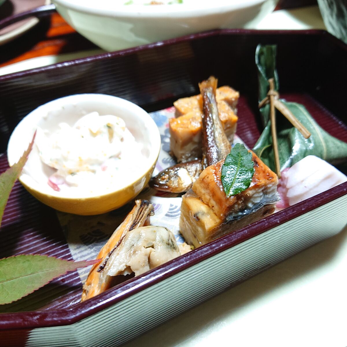 『カマス南蛮漬け、雲丹松風、パーナ貝オイル蒸し、水蛸梅香漬、鰻小袖巻、稚鮎有馬煮』