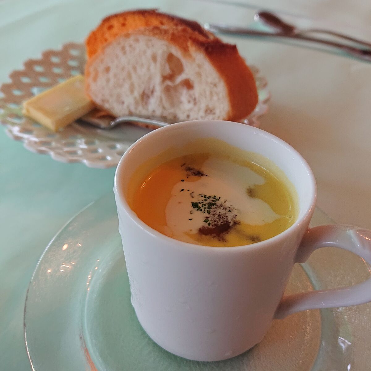 スープはかぼちゃの冷製ポタージュ。
