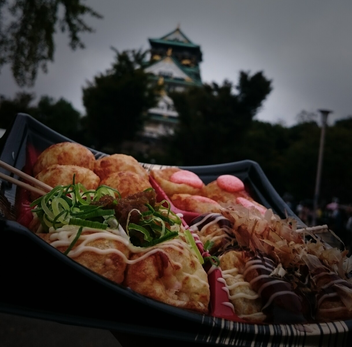 大阪城のたこ焼き屋台でおやつタイム。あ~うまうま。